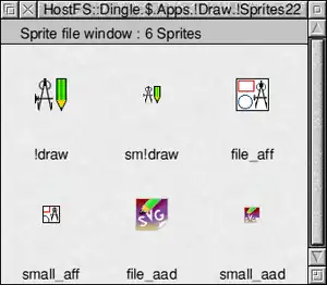Similarly, custom icons for the Application Directory may be contained within it—either .DirIcon (in any supported image format) or AppIcon.xpm under the ROX Desktop, or !Sprites and optionally !Sprites22 under RISC OS. The RISC OS Filer automatically loads these sprite files in the absence of a !Boot file, otherwise it is left to the !Boot file to load the appropriate icons.