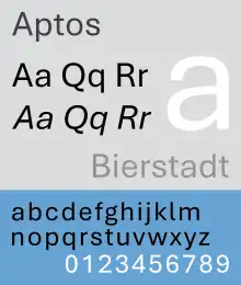 Aptos, originally named Bierstadt, is a sans-serif typeface in the neo-grotesque style developed by Steve Matteson.[3] It was released in 2023 as the new default font for the Microsoft Office suite, replacing the previously used Calibri font.[4]