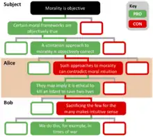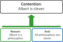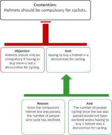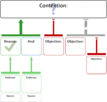 An argument map or argument diagram is a visual representation of the structure of an argument. An argument map typically includes all the key components of the argument, traditionally called the conclusion and the premises, also called contention and reasons.[1] Argument maps can also show co-premises, objections, counterarguments, rebuttals, and lemmas. There are different styles of argument map but they are often functionally equivalent and represent an argument's individual claims and the relationships between them.