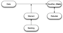 Stephen Toulmin, in his groundbreaking and influential 1958 book The Uses of Argument,[20] identified several elements to an argument which have been generalized. The Toulmin diagram is widely used in educational critical teaching.[21][22] Whilst Toulmin eventually had a significant impact on the development of informal logic he had little initial impact and the Beardsley approach to diagramming arguments along with its later developments became the standard approach in this field. Toulmin introduced something that was missing from Beardsley's approach. In Beardsley, "arrows link reasons and conclusions (but) no support is given to the implication itself between them. There is no theory, in other words, of inference distinguished from logical deduction, the passage is always deemed not controversial and not subject to support and evaluation".[23] Toulmin introduced the concept of warrant which "can be considered as representing the reasons behind the inference, the backing that authorizes the link".[24]