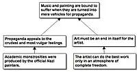 Beardsley said that the conclusion in this example is statement ②. Statement ④ needs to be rewritten as a declarative sentence, e.g. "Academic monstrosities [were] produced by the official Nazi painters." Statement ① points out that the conclusion isn't accepted by everyone, but statement ① is omitted from the diagram because it doesn't support the conclusion. Beardsley said that the logical relation between statement ③ and statement ④ is unclear, but he proposed to diagram statement ④ as supporting statement ③.