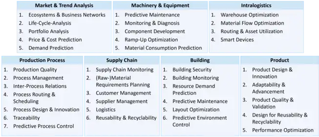 Possible applications of industrial AI and machine learning in the production domain can be divided into seven application areas:[4]