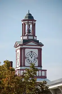 Starting in the eighteenth century,[3] several grist mills and saw mills were constructed along the Assabet River up- and down-river from the site of the current mill building complex. In 1847 Amory Maynard and William Knight constructed the first buildings of Assabet Woolen Mill on the current site. The mill, located between its mill pond and the Assabet River, produced carpets and later wool cloth used in military uniforms during the American Civil War.[1][2] The mill complex is also home to the oldest, still-working, hand-wound clock in the country (see image). The clock tower was constructed in 1892 by Lorenzo Maynard (Amory's oldest son) as a gift to the town. The weights that power the E. Howard & Co. tower clock and bell-ringing mechanisms are wound up once a week. The four clock faces have always been illuminated by electric lights.[4]