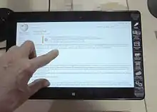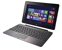 The Asus VivoTab is a convertible laptop powered by a 1.8 GHz Intel Atom Z2760 Dual Core CPU, 2 GB of RAM and 64 GB(SSD) of storage. The display is an 11.6" Corning Fit Glass display, with a capacitive touch screen, and a WACOM digitizer. The tablet has two cameras (2 MP front and 8 MP rear with flash), Wi-Fi and Bluetooth 4.0 connectivity, mini-HDMI output, a microSD card slot, and a 10.5 hour battery life.[4]