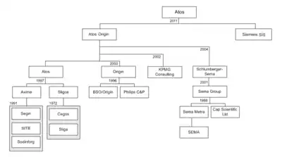 The company was formed in 1997 through a merger of two French IT companies; and combined with the Dutch-based company Origin B.V. in 2000 to become Atos Origin.[9] It subsequently acquired KPMG Consulting in 2002 and SchlumbergerSema in 2004.
