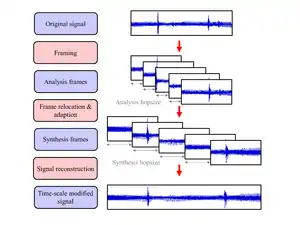 In order to preserve an audio signal's pitch when stretching or compressing its duration, many time-scale modification (TSM) procedures follow a frame-based approach.[6] Given an original discrete-time audio signal, this strategy's first step is to split the signal into short analysis frames of fixed length. The analysis frames are spaced by a fixed number of samples, called the analysis hopsize . To achieve the actual time-scale modification, the analysis frames are then temporally relocated to have a synthesis hopsize . This frame relocation results in a modification of the signal's duration by a stretching factor of . However, simply superimposing the unmodified analysis frames typically results in undesired artifacts such as phase discontinuities or amplitude fluctuations. To prevent these kinds of artifacts, the analysis frames are adapted to form synthesis frames, prior to the reconstruction of the time-scale modified output signal.
