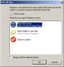 The AutoPlay dialog (in Windows XP and later) shows the result of a user placing a DVD into a DVD reader, in this case the D: drive. AutoPlay has determined that content is most likely a DVD movie and presents a set of actions to the user based on that decision. These actions are called Handlers and there are sets of Handlers associated with various types of content. The user can now make their decision and click OK to proceed. However, if they also tick the "Always do the selected action" tick box at this point, they will not be prompted the next time that particular content type is seen on that particular drive; the selected application will automatically start.