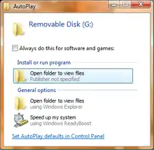 AutoPlay is a feature introduced in Windows XP which examines removable media and devices and, based on content such as pictures, music or video files, launches an appropriate application to play or display the content.[1] If available, settings in an autorun.inf file can add to the options presented to the user.