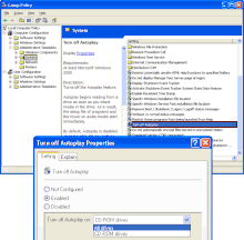 NoDriveTypeAutoRunvalue may be reset to a default value.[23] This is due to Group Policy settings in the domain taking effect. This is not a bug. - Some programs may deliberately change AutoRun Registry settings. Early versions of CD burning software like Roxio have been known to change settings in this way.[24]