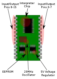 Although the BASIC Stamp 2 has the form of a 24 pin DIP chip, it is in fact a small printed circuit board (PCB) that contains the essential elements of a microprocessor system:[1]