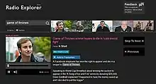 After internal usage Radio Explorer went on to become a BBC online service.[9][10] Radio Explorer worked by searching through programmes titles, subtitles, short synopsis, long synopsis and descriptions.[11] Results were then filtered by those being available to play, including clips.[12] Initially only speech networks were included, but later the service included all BBC networks.[6]