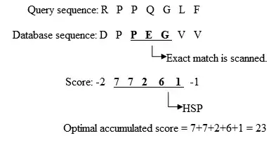 - The original version of BLAST stretches a longer alignment between the query and the database sequence in the left and right directions, from the position where the exact match occurred. The extension does not stop until the accumulated total score of the HSP begins to decrease. A simplified example is presented in figure 2.