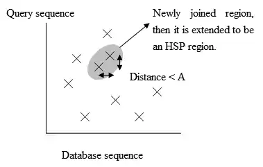 Fig. 3 The positions of the exact matches. - To save more time, a newer version of BLAST, called BLAST2 or gapped BLAST, has been developed. BLAST2 adopts a lower neighborhood word score threshold to maintain the same level of sensitivity for detecting sequence similarity. Therefore, the list of possible matching words list in step 3 becomes longer. Next, the exact matched regions, within distance A from each other on the same diagonal in figure 3, will be joined as a longer new region. Finally, the new regions are then extended by the same method as in the original version of BLAST, and the HSPs' (High-scoring segment pair) scores of the extended regions are then created by using a substitution matrix as before.