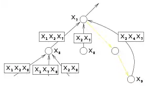 This fact can be exploited by collecting, in each node, a set of previously assigned variables whose evaluation suffices to prove that no solution exists in the subtree rooted at the node. This set is built during the execution of the algorithm. When retracting from a node, this set is removed the variable of the node and collected in the set of the destination of backtracking or backjumping. Since nodes that are skipped from backjumping are never retracted from, their sets are automatically ignored.