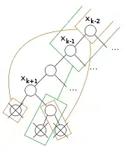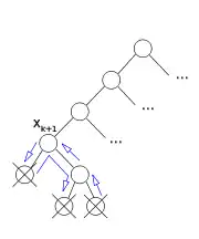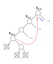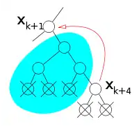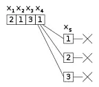 | In this example, the algorithm come back to , after trying all its possible values, because of the three crossed points of inconsistency. | The second point remains inconsistent even if the values of and are removed from its partial evaluation (note that the values of a variable are in its children) | The other inconsistent evaluations remains so even without , , and | The algorithm can backjump to since this is the lowest variables that maintains all inconsistencies. A new value for will be tried. |