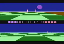 Ballblazer is a simple one-on-one sports-style game bearing similarities to basketball and soccer.[5] Each side is represented by a craft called a "rotofoil",[5] which can be controlled by either a human player or a computer-controlled "droid" with ten levels of difficulty. The game allows for human vs. human, human vs. droid, and droid vs. droid matches. The basic objective of the game is to score points by either firing or carrying a floating ball into the opponent's goal. The game takes place on a flat, checkerboard playfield, and each player's half of the screen is presented from a first-person perspective.[5]