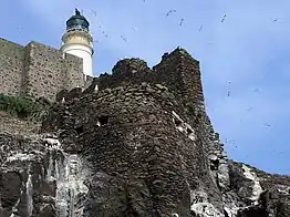An extraordinary chapter in the Bass Rock's history was its seizure by four Jacobites imprisoned in its castle, which they then held against government forces for nearly three years, 1691–1694.[29] In 1688 the Catholic King James VII had been deposed by and replaced by William III of England and Mary II of England. During the ensuing years, supporters of exiled King James, known as ‘Jacobites’, fought unsuccessful wars of resistance in Scotland and Ireland, where Catholic allegiances were strongest. The Bass Rock's castle was one of the last places in Scotland to be surrendered to William III's new government, being handed over in 1690 by governor Charles Maitland. William III's government then chose it as a prison for its Jacobite opponents. In 1691 four captured Catholic Jacobite officers were imprisoned there. On 18 June 1691, they managed to seize the Bass Rock's castle while the much-depleted garrison was outside its walls for the difficult task of unloading a coal ship on the rocky landing stage. The garrison had no choice but to depart on the coal ship. When news spread on the nearby Scottish mainland, Jacobite supporters made covert boat trips to the Bass Rock with supplies and with men who wished to join the defenders. Word reached King James, exiled in France under the protection of Louis XIV, and ships from France brought supplies, including two large rowing boats from King James. The Jacobites used these boats to mount raids on the mainland for more supplies. They used the castle's cannon to waylay some passing ships. William III's government sent two large warships to bombard the castle but its position high above a sheer rock face made it impregnable. A naval blockade of the Bass Rock was then attempted instead which made access to fresh supplies increasingly difficult for the defenders. Their numbers had fallen since some were captured during raids on the mainland – there had been possibly 20 defenders at most. Furthermore, prospects for the Jacobite cause elsewhere in Britain had become hopeless. However, William III's government was itself in despair at how to end the Bass Rock siege. In early 1694 the Bass Rock prisoners’ leader, Captain Michael Middleton, negotiated a visit by government representatives to discuss a solution. Middleton guessed that his adversaries lacked any means for estimating the number of defenders or their reserves of food, in view of the covert comings and goings to the island by ships from the mainland or from France. Accordingly, he stage-managed the visit to give a deceptive impression of strength on both counts. The ruse succeeded. On 18 April 1694 the Jacobite defenders accepted the very attractive surrender terms which they were offered – freedom, free transport to France if they wished, and release from prison for people who had been caught helping them from the mainland.