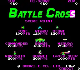 Battle Cross is a shoot 'em up released in arcades by Omori Electric (also known as Omori Electronic) in 1982.[1] The player controls a fighter spacecraft by moving around the screen and shooting enemies. In 1984 Sony published a version for the Sony Hit-Bit 75 MSX computer.[2]