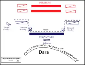 The Persians, outnumbering the Romans by 15,000 men, deployed around 20 stades away from the town of Daras and drew up their battle lines. Despite being outnumbered, Belisarius decided to give battle. He dug a number of ditches to block the Persian cavalry, leaving gaps between them to allow a counterattack.[7] According to Irfan Shahid, the tactic was adopted from the Persians at the Battle of Thannuris two years earlier.[8] These were pushed forward on either flank of his position, while his center was refused back. Here he placed his unreliable infantry behind the center ditch, being placed close enough to the walls of the fortress to provide supporting fire from the city battlements. On the left and right flanks were the Byzantine cavalry, of questionable quality. Supporting them on their interior flanks were small bodies of Huns: 300 Hun cavalry under Sunicas and Aigan supporting the left; and as many more Huns on the right under Simmas and Ascan. Belisarius also placed a body of Heruli cavalry under Pharas in ambush position off his left flank. A reserve composed of his own bucellarii household cavalry was held behind his center and commanded by John the Armenian, his trusted lieutenant and boyhood friend.