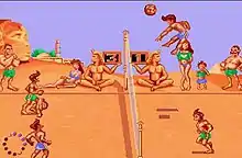 Beach Volley is a beach volleyball video game developed by Ocean France for the Amiga, Atari ST, Amstrad CPC, Commodore 64, and ZX Spectrum, released by Ocean Software in 1989. A stranger interrupts a beach volleyball game and offering the player to join the "Ocean Beach Volley" worldwide tournament, to play against the best from eight other countries. The winner of this competition will receive $250,000 dollars.