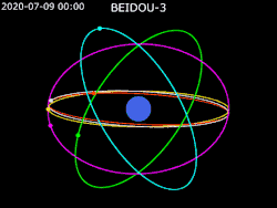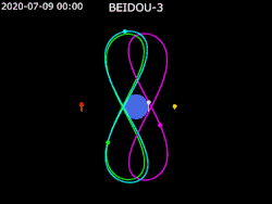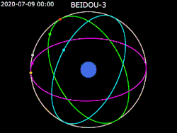 The current service, BeiDou-3 (third-generation BeiDou), provides full global coverage for timing and navigation, along with Russia's GLONASS, the European Galileo, and the US's GPS.[7] It consists of satellites in three different orbits, including 24 satellites in medium-circle orbits (covering the world), 3 satellites in inclined geosynchronous orbits (covering the Asia–Pacific region), and 3 satellites in geostationary orbits (covering China). The BeiDou-3 system was fully operational in July 2020.[8][9][10][11][12] In 2016, BeiDou-3 reached millimeter-level accuracy with post-processing.[13]