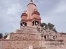 Near the western part of the square are two Vatsala temples, both of which were consecrated in 1695 by Jitamitra Malla.[40] The temple of Siddhi Vatsala, similar to the Nritya Vatsala is a stone temple and is generally referred as Lohan dega, translating to "stone temple".[36] It is dedicated to Siddhi Lakshmi, a form of Devi and is also referred as the temple of Siddhi Lakshmi. The temple is especially noted for its guardian statues, which includes a man and a woman holding a child and a chained dog, a pair of camels, horses, rhinoceroses and mythical beasts.[40] Its sister temple Yantra Vatsala, before being destroyed in the 1934 earthquake, used to exist north of it. Unlike the Siddhi Lakshmi temple, it was not restored after the earthquake and instead a one storey building has been constructed in order to shelter the image of the deity.[41] It is believed that Yantra Vatsala was built in a similar style to its sister temple, Siddhi Vatsala but a complete pre-1934 picture of the temple has not been discovered.[41]