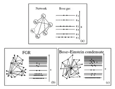 The evolution of many complex systems, including the World Wide Web, business, and citation networks, is encoded in the dynamic web describing the interactions between the system’s constituents. The evolution of these networks is captured by the Bianconi-Barabási model, which includes two main characteristics of growing networks: their constant growth by the addition of new nodes and links and the heterogeneous ability of each node to acquire new links described by the node fitness. Therefore the model is also known as fitness model. Despite their irreversible and nonequilibrium nature, these networks follow the Bose statistics and can be mapped to a Bose gas. In this mapping, each node is mapped to an energy state determined by its fitness and each new link attached to a given node is mapped to a Bose particle occupying the corresponding energy state. This mapping predicts that the Bianconi–Barabási model can undergo a topological phase transition in correspondence to the Bose–Einstein condensation of the Bose gas. This phase transition is therefore called Bose-Einstein condensation in complex networks. Consequently addressing the dynamical properties of these nonequilibrium systems within the framework of equilibrium quantum gases predicts that the “first-mover-advantage,” “fit-get-rich (FGR),” and “winner-takes-all” phenomena observed in a competitive systems are thermodynamically distinct phases of the underlying evolving networks.[2]