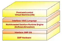 - At second, it is a hybrid multithreaded dataflow runtime engine controlled by a von-Neumann front-end VM. The dataflow runtime engine executes tagged-token contextual parallel instructions (opposite to the restricted fork-join paradigm) while the von-Neumann front-end VM initializes contexts and feeds the dataflow runtime engine with marshaled clusters of instructions.