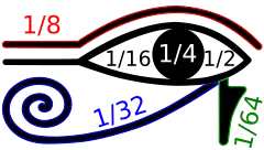 The scribes of ancient Egypt used two different systems for their fractions, Egyptian fractions (not related to the binary number system) and Horus-Eye fractions (so called because many historians of mathematics believe that the symbols used for this system could be arranged to form the eye of Horus, although this has been disputed).[2] Horus-Eye fractions are a binary numbering system for fractional quantities of grain, liquids, or other measures, in which a fraction of a hekat is expressed as a sum of the binary fractions 1/2, 1/4, 1/8, 1/16, 1/32, and 1/64. Early forms of this system can be found in documents from the Fifth Dynasty of Egypt, approximately 2400 BC, and its fully developed hieroglyphic form dates to the Nineteenth Dynasty of Egypt, approximately 1200 BC.[3]
