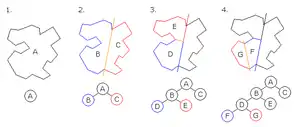 Applying this algorithm recursively to the BSP tree generated above results in the following steps: