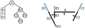 | vi. | We have now added all of the lines in front of A to the BSP tree, so we now start on the list of lines behind A. Choosing a line (B1) from this list, we add B1 to a node and split the remainder of the list into lines in front of B1 (i.e. D1), and lines behind B1 (i.e. C1). | ![]() |