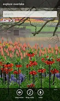 With Windows Phone 7.5, the first major update to Windows Phone Microsoft included several new features to the Bing Hub including the new Bing Vision application that allows users to scan QR Codes, books, price tags, and various other items but unlike Google Goggles, can not scan any object due to its limited functionality, other than scanning objects Bing Vision comes with a built-in version of the Bing Translator that can scan texts and translate it into the phone's language, Engadget did a test they scanned the back cover a book and it only picked up about 90 percent of the words in the summary after the text was found, Bing Vision's translation feature supports 26 languages.[2] Bing Maps also received new features namely the Bing Local Scout which takes a look at businesses around the user's location and gives them a list of local restaurants, bars, and shopping centres. The Bing Hub can also open up Bing Local Scout and got a new feature added in Windows Phone 7.5 called Bing Audio, a service similar to Shazam which can recognise songs and show the album in the Zune Marketplace. A notable difference between the Bing Hub and the website is the lack of Bing Travel.[3]
