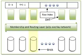 The BitVault architecture is composed of multiple bricks which constitute a logical 160 bit address space, each associated with hash of some data. The association is maintained in a Distributed Hash Table (DHT). The DHT partitions the entire hash table into smaller hash tables. For example, if there are n peers, the hash table would be divided into n hash tables, each starting from the row next to where its immediate predecessor ended. Each DHT has its associated brick, and the extent of the logical address space a brick is responsible for is called its Zone. The bricks communicate using peer-to-peer technology, over the Membership and Routing Layer (MRL). Lookup of any data object can be done by n bricks in parallel, in its own zone, giving an efficiency of O (log N).