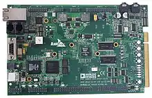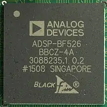 The Blackfin is a family of 16-/32-bit microprocessors developed, manufactured and marketed by Analog Devices. The processors have built-in, fixed-point digital signal processor (DSP) functionality performed by 16-bit multiply–accumulates (MACs), accompanied on-chip by a microcontroller.[1] It was designed for a unified low-power processor architecture that can run operating systems while simultaneously handling complex numeric tasks such as real-time H.264 video encoding.[2][3]