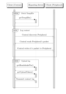The DDC component operates on top of the existing Bluetooth Low Energy protocol, defining how two devices acknowledge each other's presence.[10]: p. 2 The DRSC component uses HTTPS to communicate a timeline of visits to a centralized server owned by a health authority once a user has tested positive for an infection. The health authority can then, using the log, notify the users who came in contact with the infected patient.[10]: p. 2