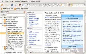 Newer browsers have expanded the "bookmark" feature to include variations on the concept of saving links. Mozilla Firefox introduced live bookmarks in 2004,[5] which resemble standard bookmarks but contain a list of links to recent articles supplied by a news site or weblog, which is regularly updated via RSS feeds; however, Mozilla removed this feature in 2018.[6] "Bookmarklets" are JavaScript programs stored as bookmarks that can be clicked to perform a function.