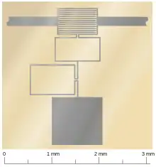 Losses in the circuit cause the maximum delay to be reduced, a problem that can be ameliorated with the use of high-temperature superconductors. Such a circuit has been realised as a lumped-element planar implementation in thin-film using microstrip technology. The traces are the superconductor yttrium barium copper oxide and the substrate is lanthanum aluminate. The circuit is for use in the microwave band and has a centre frequency of approximately 2.8 GHz and achieves a peak group delay of 0.7 ns. The device operates at a temperature of 77 K. The layout of the components corresponds to the layout shown in the circuit diagram at the head of this article, except that the relative positions of L' and C' have been interchanged so that C' can be implemented as a capacitance to ground. One plate of this capacitor is the ground plane and it thus has a much simpler pattern (a simple rectangle) than the pattern of C which needs to be a series capacitor in the main transmission line.[2]