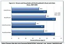 According to NTIA (2011),[25] almost one-third of American households still lack a broadband connection. "The rates for White (68%) and Asian non-Hispanics (69%) exceed those for Black non-Hispanics (50%) and Hispanics (45%) by 18 percentage points or more. Rural America lags behind urban areas by ten percentage points (60% versus 70%)."