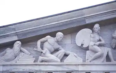 The left, center, and right sections of the pediment atop the Museum, designed by Edmond Amateis and includes clothed, semi-nude and nude figures.