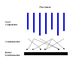 - Concurrent computation: every participating processor may perform local computations, i.e., each process can only make use of values stored in the local fast memory of the processor. The computations occur asynchronously of all the others but may overlap with communication.