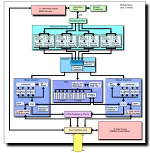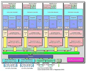 - A module consists of a coupling of two "conventional" x86 out of order processing cores. The processing core shares the early pipeline stages (e.g. L1i, fetch, decode), the FPUs, and the L2 cache with the rest of the module.