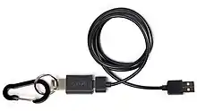 One end of the cable plugs into a computer. The other end of the cable is a carabiner that attaches to the user.[20]