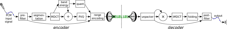 The decoder unpacks the individual components from the range coded bitstream, multiplies the band energy to the band shape coefficients and transforms them back (via iMDCT) to PCM data. The individual blocks are rejoined using weighted overlap-add (WOLA). Many parameters are not explicitly coded, but instead reconstructed by using the same functions as the encoder.