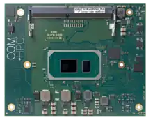 The computer-on-module for high performance compute (COM-HPC) form factor standard targets high I/O and computer performance levels. Each COM-HPC module integrates core CPU and memory functionality and input and output including USB up to Gen 4, audio (MIPI SoundWire, I2S and DMIC), graphics, (PCI Express) up to Gen. 5, and Ethernet up to 25 Gbit/s per lane. All I/O signals are mapped to two high density, high speed and low profile connectors on the bottom side of the module. COM-HPC employs a mezzanine-based approach. The COM modules plug into a carrier or base board that is typically customized to the application. Over time, the COM-HPC mezzanine modules can be upgraded to newer, backwards-compatible versions. COM-HPC targets Industrial, Military/Aerospace, Gaming, Medical, Transportation, IoT, and General Computing embedded applications and even scales up to RAM and performance hungry server or edge server applications.