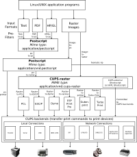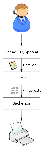 CUPS provides a mechanism that allows print jobs to be sent to printers in a standard fashion. The print data goes to a scheduler[14] which sends jobs to a filter system that converts the print job into a format the printer will understand.[15] The filter system then passes the data on to a backend—a special filter that sends print data to a device or network connection.[16] The system makes extensive use of PostScript and rasterization of data to convert the data into a format suitable for the destination printer.
