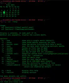 cal is a command-line utility on a number of computer operating systems including Unix, Plan 9, Inferno and Unix-like operating systems such as Linux that prints an ASCII calendar of the given month or year. If the user does not specify any command-line options, cal will print a calendar of the current month. The command is a standard program on Unix and specified in the Single UNIX Specification.