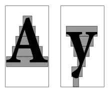 Rather than using kerning pairs or relying on simple side-bearing measurements, Calamus’ native fonts encode left and right bounds for each character at eight different latitudes.[5] Unlike the kerning information in other formats, the resulting jigsaw-pieces can be used to fit characters together, even if those characters are from different fonts or if they are set at different sizes.