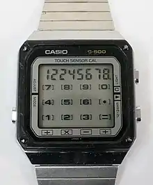 A calculator watch is a digital watch with a built-in calculator, usually including buttons on the watch face. Calculator watches were first introduced in the 1970s and continue to be produced, despite falling from their peak popularity during the 1980s. The most dominant brands were the Casio Databank series and Timex.