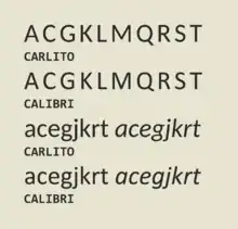 In 2013, Google released a freely-licensed font called Carlito, which is metric-compatible to Calibri, as part of ChromeOS.[24] Carlito's metric-compatibility ensures ChromeOS users can correctly display and print a document designed in Calibri without disrupting its layout. Carlito's glyph shapes are based on the prior open-source typeface Lato.[25]