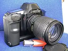 The Canon T90, introduced in 1986, was the top of the line in Canon's T series of 35 mm Single-lens reflex (SLR) cameras. It is the last professional-level manual-focus camera from Canon, and the last professional camera to use the Canon FD lens mount. Although it was overtaken by the autofocus revolution and Canon's new, incompatible EOS (Electro-Optical System) after only a year in production, the T90 pioneered many concepts seen in high-end Canon cameras up to the present day, particularly the user interface, industrial design, and the high level of automation.